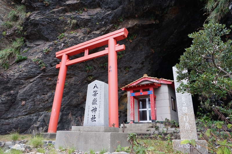 一湊湾を囲むように海に突き出る矢筈岬の西側に天然の洞穴がありその中に神社がある。入口には赤鳥居、その奥に拝があり、最奥に屋久杉を主材とした本殿がある。現在は半島に延びる車道から神社までの参道が整備されているが、かつては船での往来が一般的だった。また、内部には紅白の大漁祈願旗が奉納されるなど、海との係わりが深い一湊区を象徴する神社である。