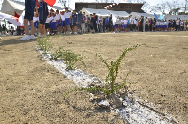 トラックの最内側は線が消えることもあり、杉の葉が埋められる |